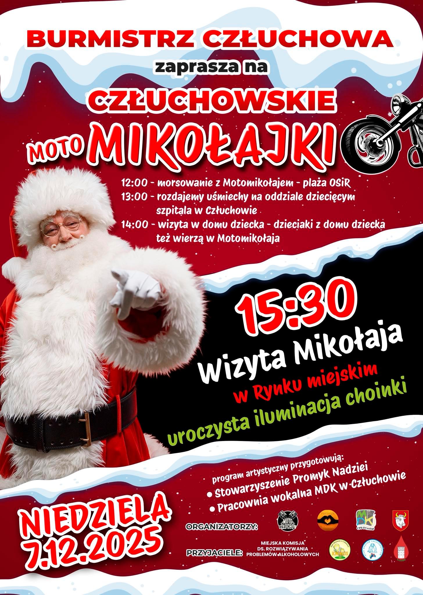 Tradycyjnie Świętego Mikołaja przywiozą człuchowscy motocykliści. Temu niezwykłemu gościowi towarzyszyć będą śnieżynki, renifery i inne postacie z bajek. – Nie zabraknie słodyczy, animacji i wspólnych zdjęć z Mikołajem – zapewnia Miłosz Gawroński z Miejskiego Domu Kultury w Człuchowie. W tym roku program artystyczny na ten wieczór przygotowuje Stowarzyszenie „Promyk Nadziei”. W trakcie imprezy nastąpi także uroczyste włączenie iluminacji na miejskiej choince, która już stoi na człuchowskim Rynku.
