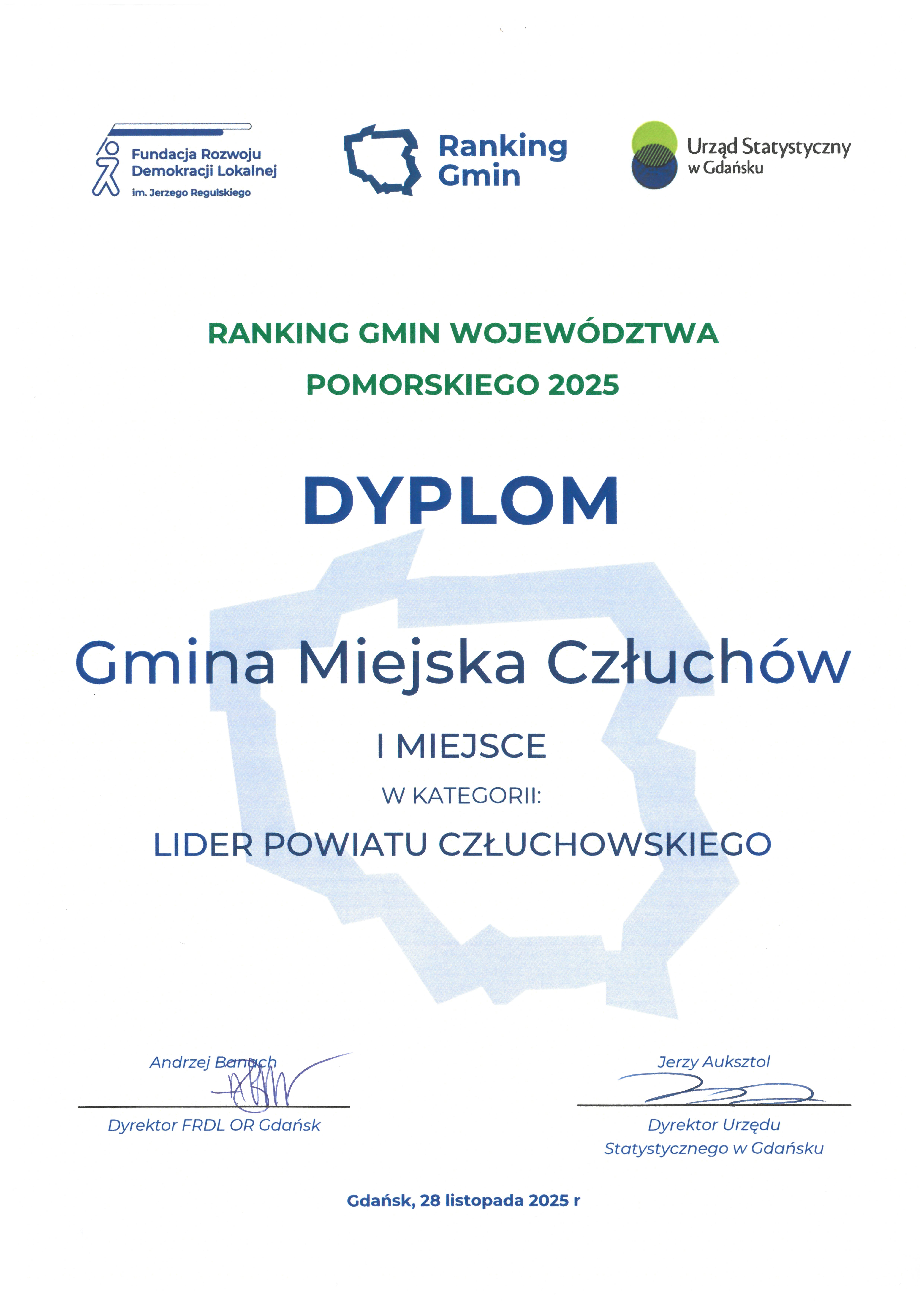 Po raz piąty z rzędu Gmina Miejska Człuchów otrzymała tytuł Lidera Powiatu Człuchowskiego w Rankingu Gmin Województwa Pomorskiego. Wyróżnienie takie przyznała samorządowi Fundacja Rozwoju Demokracji Lokalnej. Jest to wynik badań przeprowadzonych przez te instytucję we współpracy z Urzędem Statystycznym w Gdańsku.