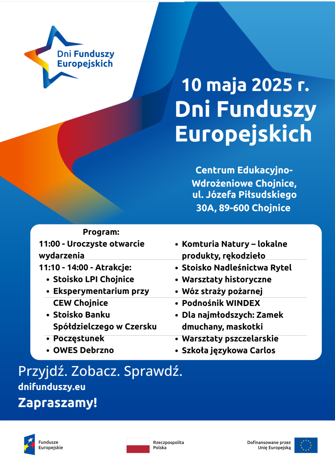 Lokalny Punkt Informacyjny Funduszy Europejskich oraz Centrum Edukacyjno-Wdrożeniowe w Chojnicach mają zaszczyt zaprosić Państwa na Festyn Dni Funduszy Europejskich, który odbędzie się w sobotę, 10 maja 2025 r. w godzinach 11:00-14:00. Wydarzenie będzie miało miejsce przy CEW w Chojnicach, ul. Józefa Piłsudskiego 30A, 89-600 Chojnice.